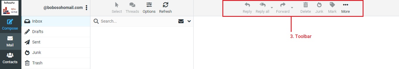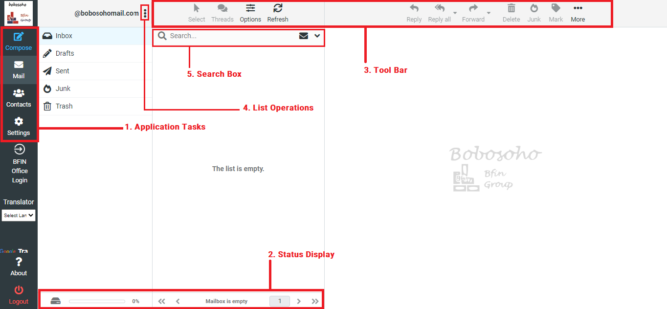 Once authenticated, the screen of Bobosohomail is divided into five functional parts which are explained here: