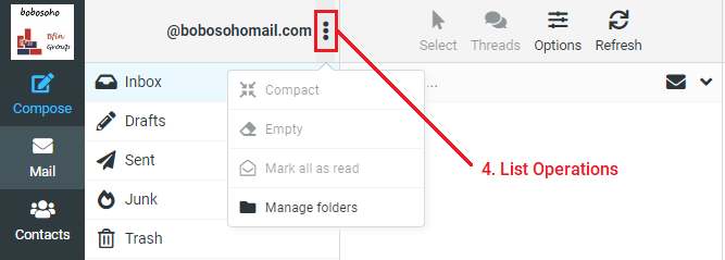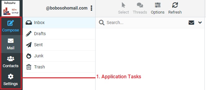 Bobosohomail application provides different main tasks such as Email, Address Book, Settings, etc. Use this list to switch from one task to another. That will reload the screen with a specific view for the selected task. Below the main tasks, the button to terminate the current session (Logout) is also located here.
