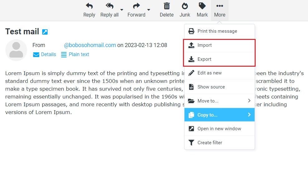 You can easily download messages in single or multiple ways, to download an email message, select a message in the Messages List and then choose Download (.eml) from the More menu in the toolbar. Choose where to save the exported .eml file if prompted, otherwise, find the file in the “Downloads” folder on your computer. For multiple Downloads; Multiple messages will be packed into a Zip file for downloading. Select individual messages in the Messages List and follow the instructions for downloading a single message. You must unpack the downloaded .zip archive to access the individual message files.