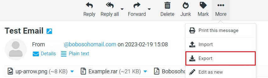 Messages from your inbox or any other folder can be downloaded to your computer for archiving or backup. When exporting, messages will be saved as single .eml files.