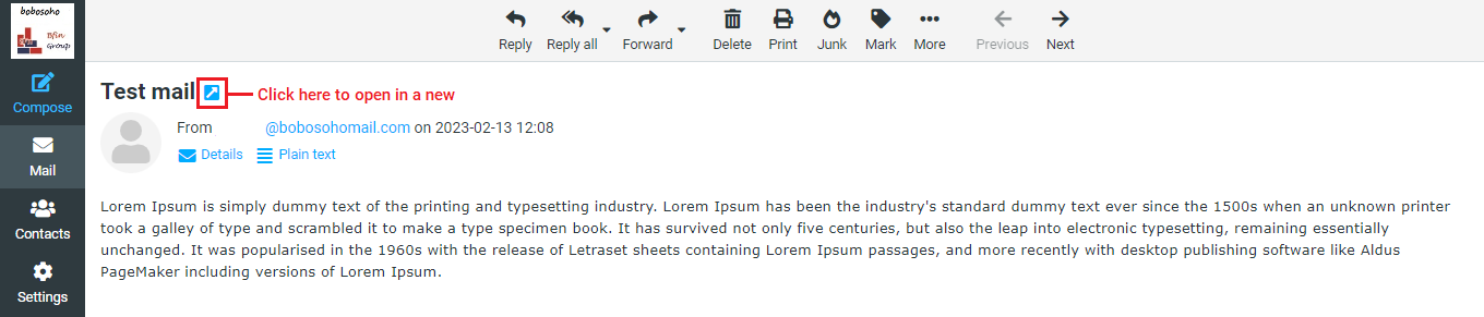 While looking at a message in the preview pane, it can be opened in a new window by pressing the button. When opening a message in full-size view, the toolbar above shows buttons for possible actions to choose for this message.