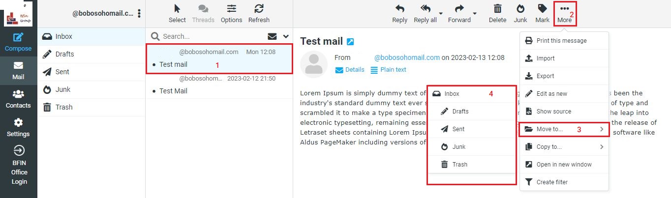 We can easily move messages from each folder to another folder easily just only four steps. First, use the drop-down list on the top right of the toolbar, Secondly, click on More options, Thirdly click on Move to then chose the folder where you want to move the current message.