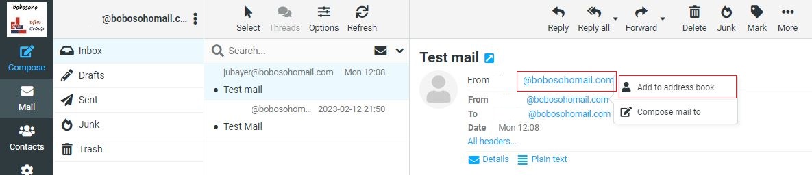 Every email address referenced in the current message, either as sender or recipient, can be saved to the address book with a single click on the Add to address book by clicking on this icon