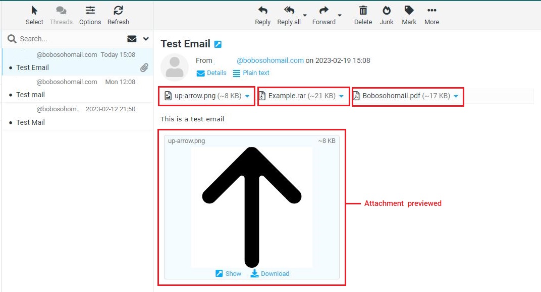 If the opened message has any files attachments, these are listed on the right, next to the message text. Click on the file name to open or download it. If the file can be displayed directly in the web browser, a preview window will be opened showing the attachment. This will happen for images, text files, and PDFs if your browser indicates being able to display them.