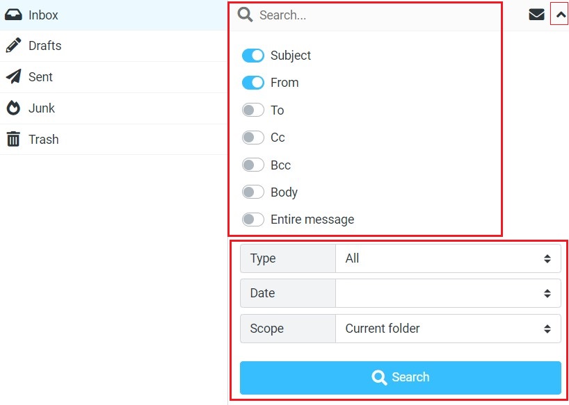 Open the search options menu by clicking the search icon right in the search box, and click on this icon (). You can select which parts of the message should be searched for the entered term. You can also type specific search criteria directly into the box, such as “from Subject: From, To, CC, BCC, Body, etc.